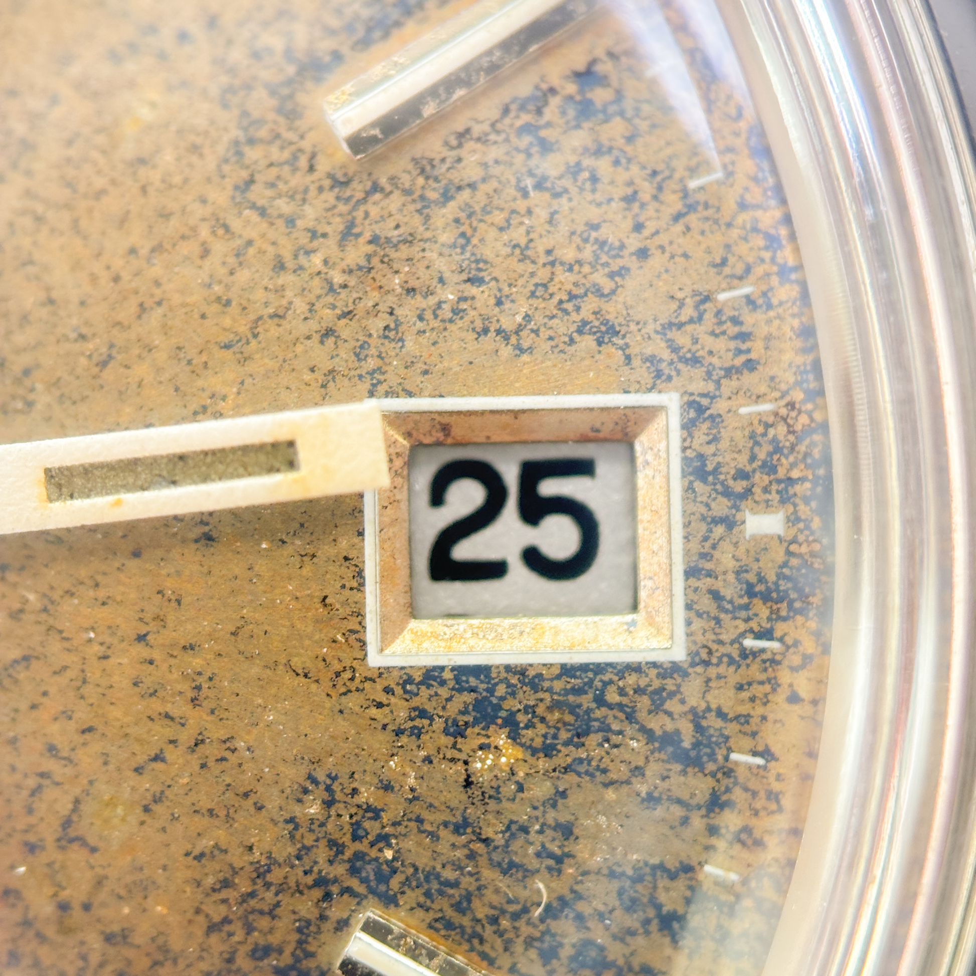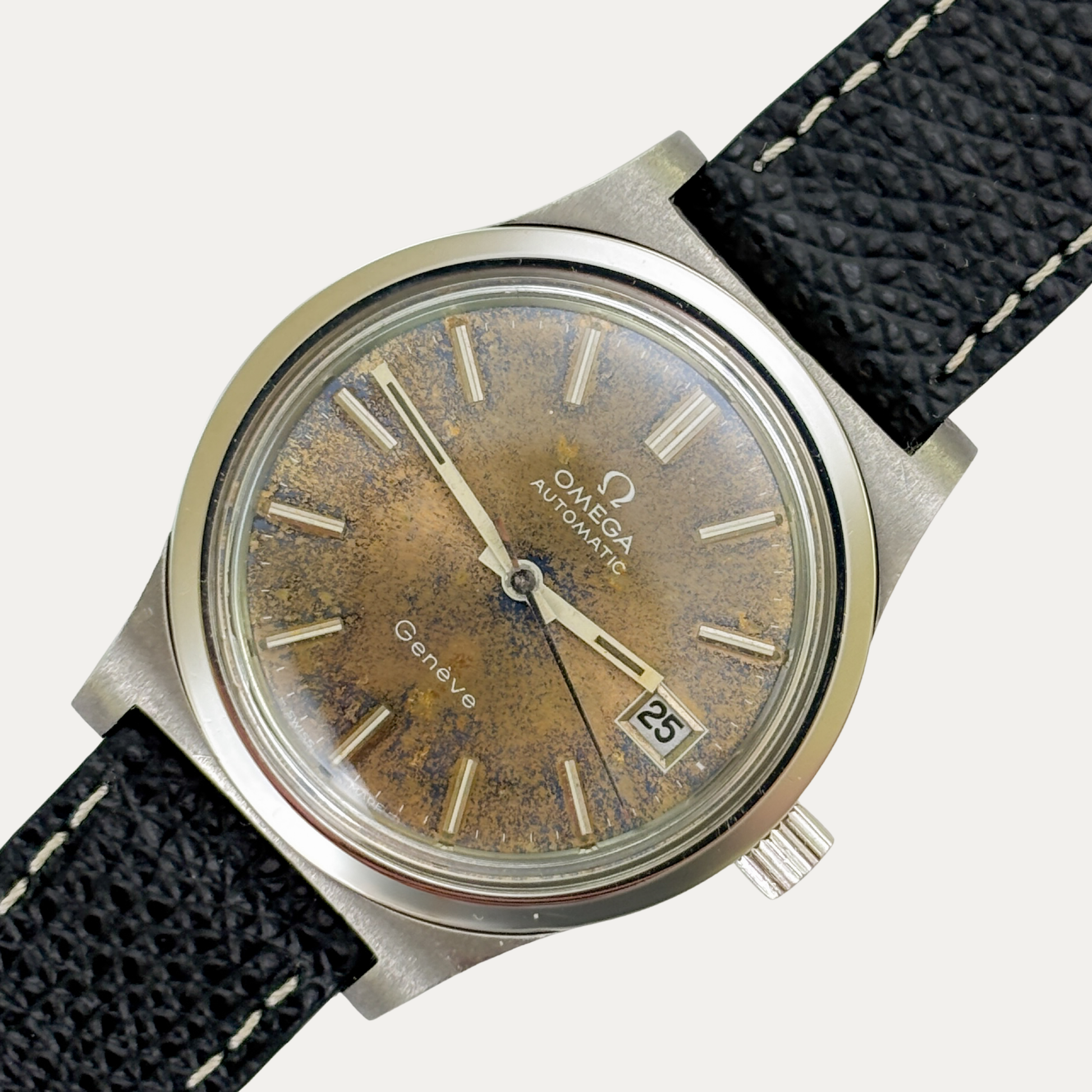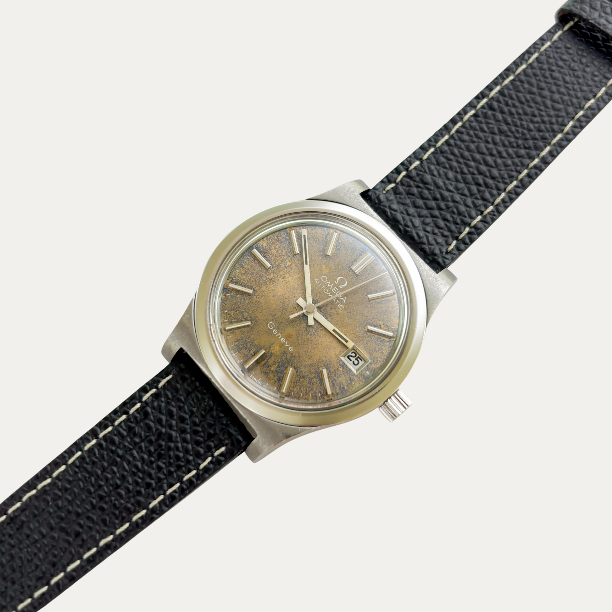 Over fifty years, this dial has developed what collectors call a "jeans dial" — a natural, warm patina that no restoration can replicate. One of the most coveted variations in vintage Omega collecting, and on this reference it is exactly as it should be: unrestored, honest, and genuinely beautiful.