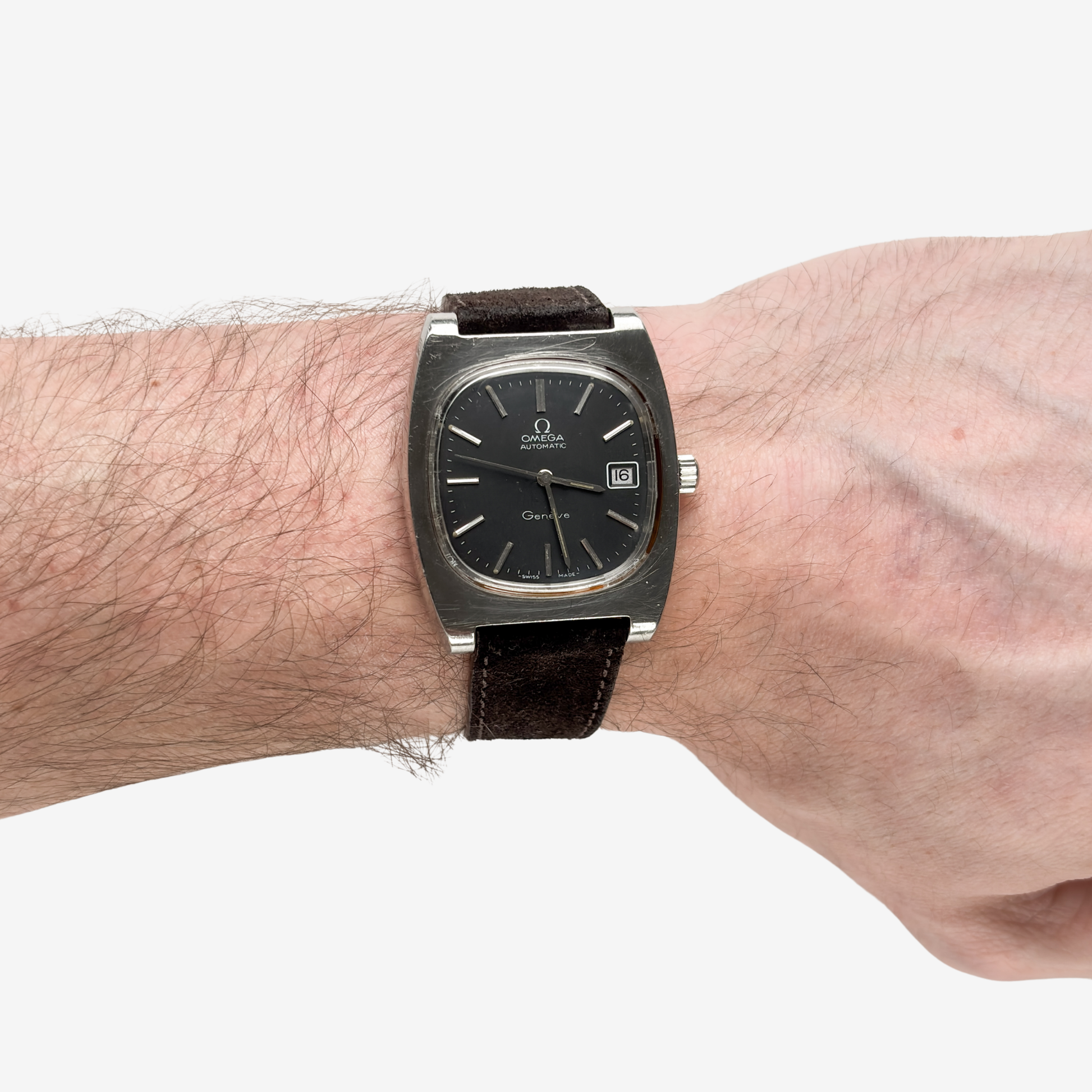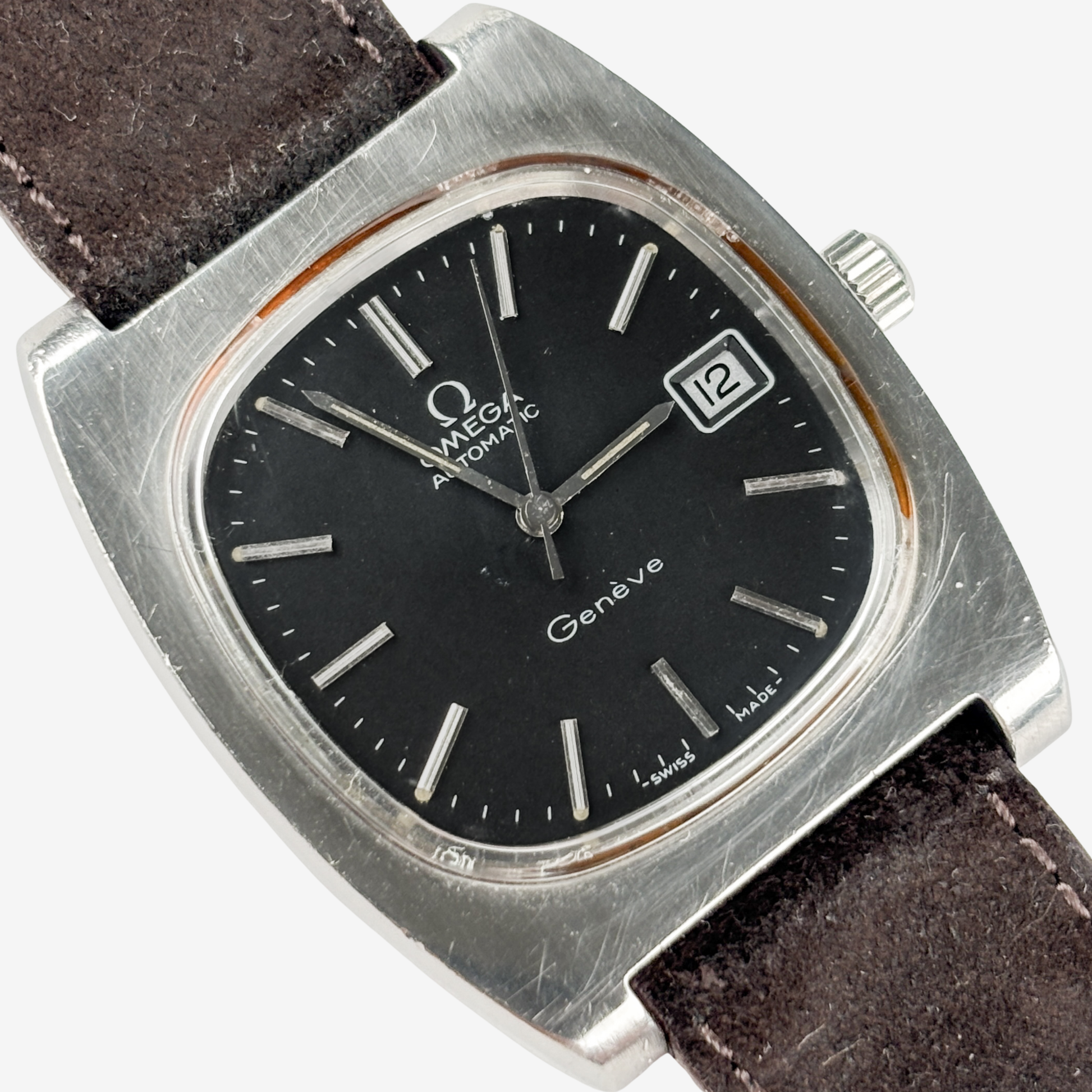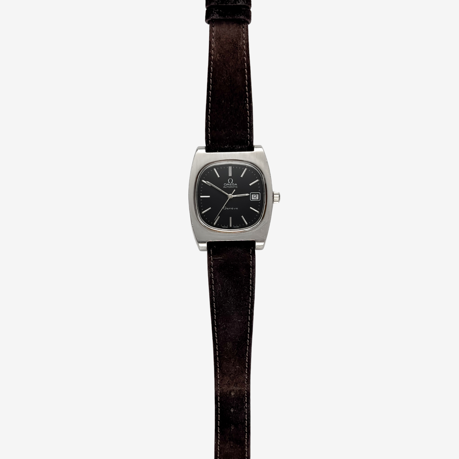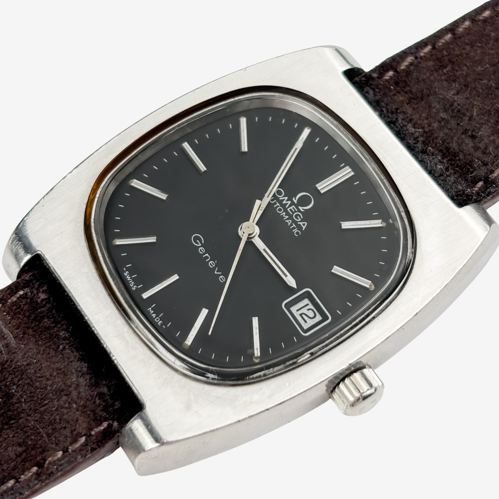 The Omega Genève 166.0190 is a striking 1970s creation, produced between 1974 and 1975 and known for its signature TV dial and refined tonneau case. The stainless steel case measures 36mm wide and 44mm lug to lug, giving it a bold yet elegant wrist presence that perfectly reflects the design spirit of the seventies. The screw in caseback and clean lines complete the look.