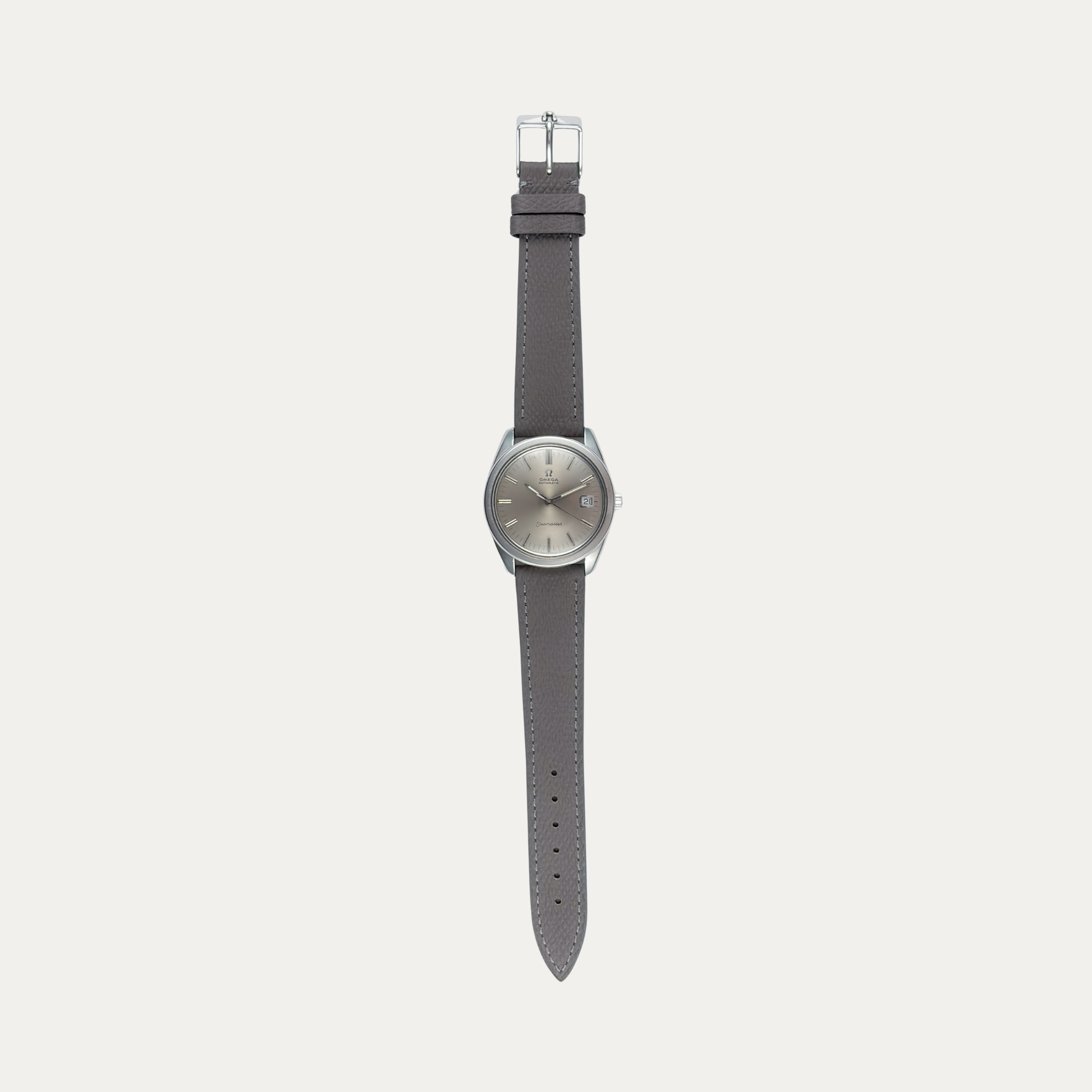 It comes on a handmade grey leather strap by LIC Leather, crafted in Belgium, paired with the original Omega buckle. The combination feels considered without being overdressed.